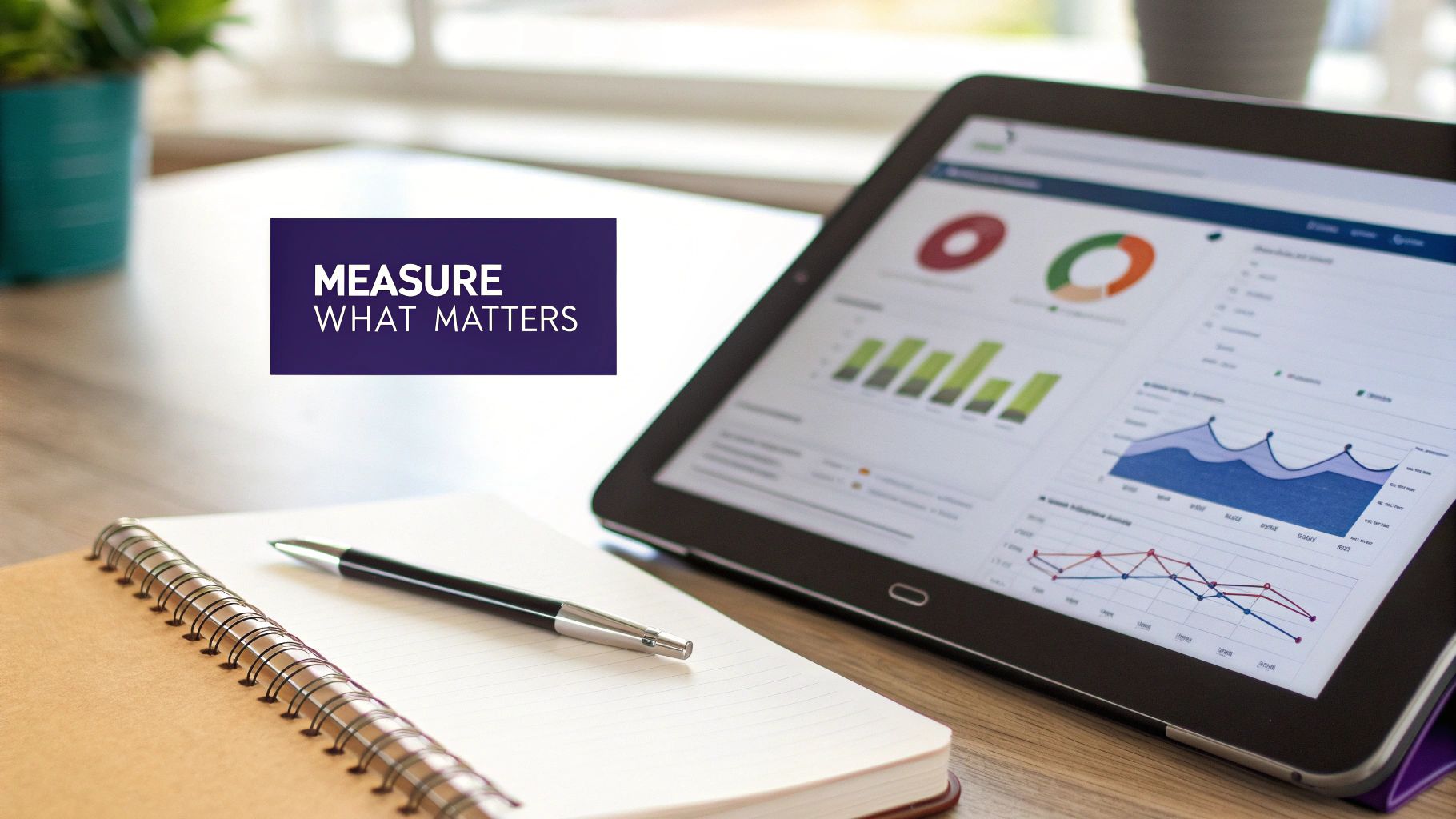 A tablet shows business analytics charts and graphs, with a notebook and pen, emphasizing data-driven decisions.