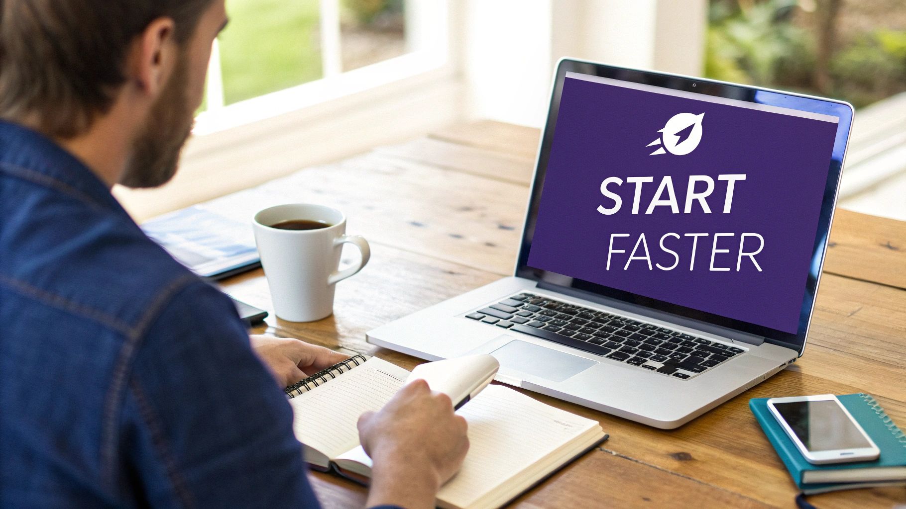 A man writes in in a notebook at a wooden desk with a laptop displaying 'START FASTER' and a rocket logo.