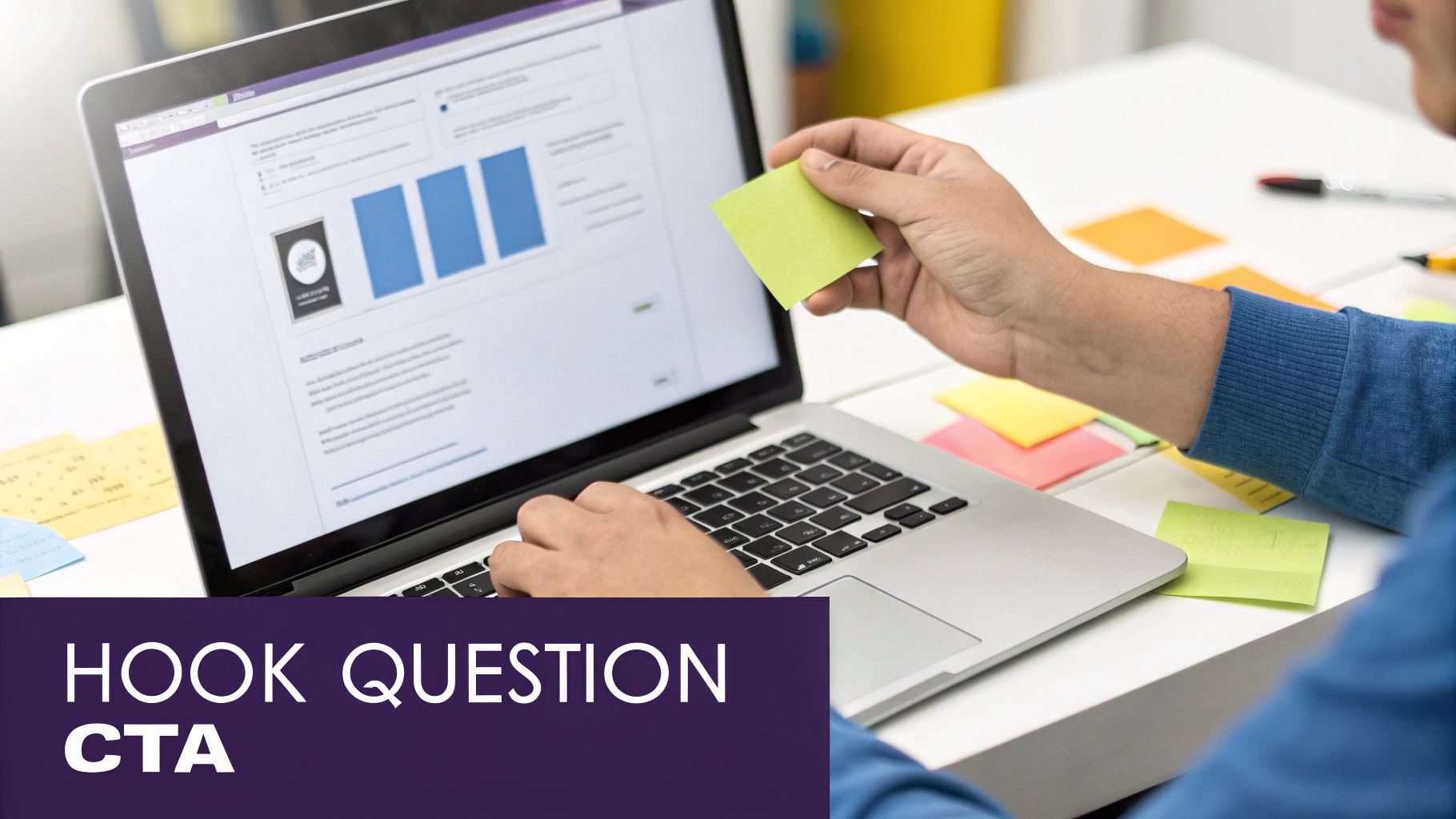 Person typing on laptop, holding a green sticky note while analyzing a screen with charts and data.
