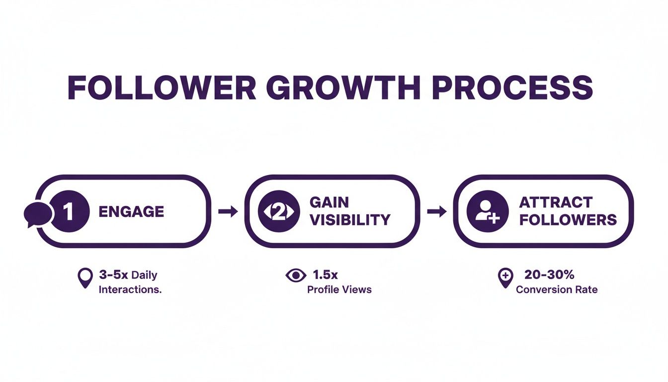 A three-step follower growth process diagram: Engage, Gain Visibility, and Attract Followers with metrics.