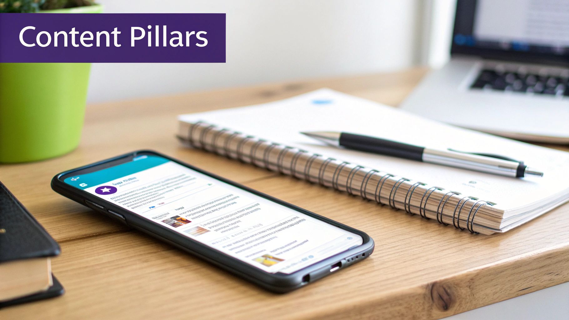 A desk with a smartphone displaying social media, a notebook, and a 'Content Pillars' banner.