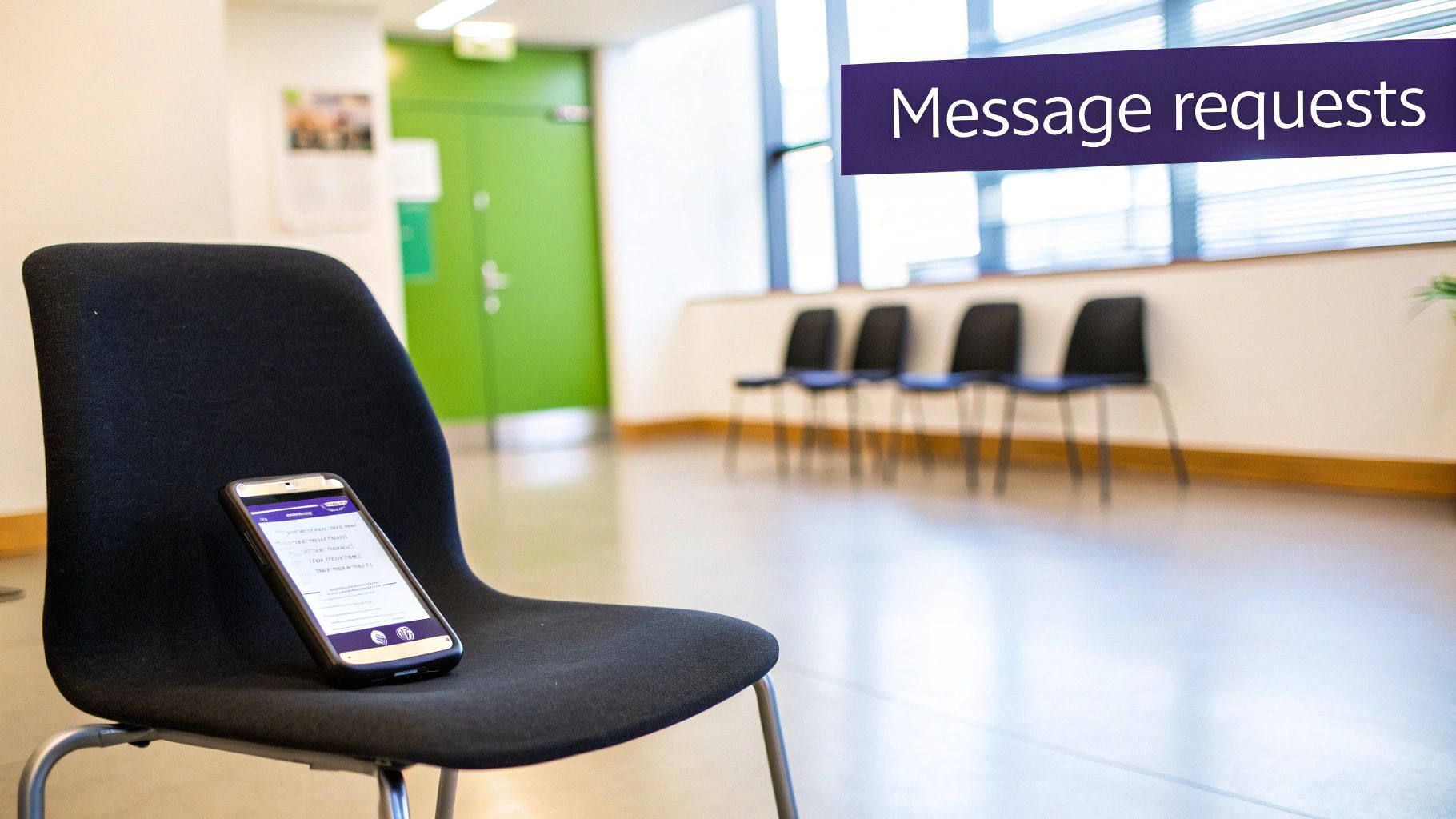 Office waiting room with a smartphone displaying messages on a black chair and a 'Message requests' banner.